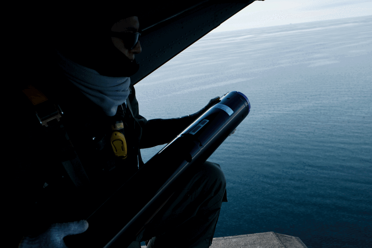 In total, 74 AXCTD (Airborne eXpendable Conductivity, Temperature, and Depth) and AXBT (Airborne Bathy-Thermograph) probes were deployed. These expendable instruments were launched from a helicopter into ice cracks between 15 and 540 m wide to float on the ocean surface. The floating portion releases a probe, which sinks toward the seabed, and transmits data back to the helicopter.